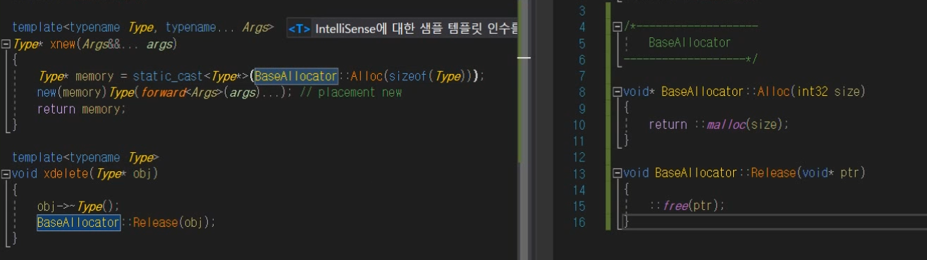 - heap에서 직접 메모리를 가져오지 않고, 개발자가 지정한(이미 가지고 있는) 메모리를 사용하게 하려면 placement new를 사용합니다.